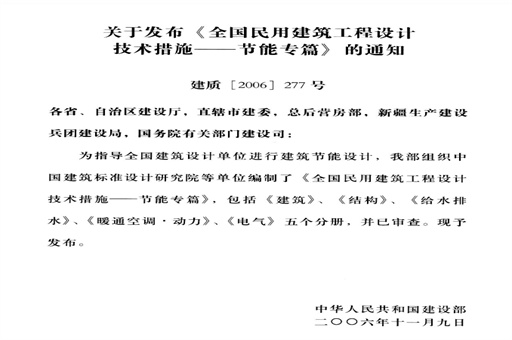 《全國(guó)民用建筑工程設(shè)計(jì)技術(shù)措施--節(jié)能專篇》(2007)是由建設(shè)部工程質(zhì)量安全監(jiān)督與行業(yè)發(fā)展司組織中國(guó)建筑標(biāo)準(zhǔn)設(shè)計(jì)研究院等單位編制的一套以指導(dǎo)全國(guó)建筑設(shè)計(jì)單位進(jìn)行建筑節(jié)能設(shè)計(jì)的技術(shù)文件,是對(duì)《全國(guó)民用建筑工程設(shè)計(jì)技術(shù)措施》(2003)節(jié)能設(shè)計(jì)部分內(nèi)容的補(bǔ)充、深化、匯總和完善,是節(jié)能設(shè)計(jì)標(biāo)準(zhǔn)的細(xì)化與延伸。《全國(guó)民用建筑工程設(shè)計(jì)技術(shù)措施--節(jié)能專篇》(2007)包括《建筑》、《結(jié)構(gòu)》、《給水排水》、《暖通空調(diào)--動(dòng)力》、《電氣》五個(gè)分冊(cè),內(nèi)容基本涵蓋目前可應(yīng)用于工程建設(shè)節(jié)能技術(shù)的全部?jī)?nèi)容。